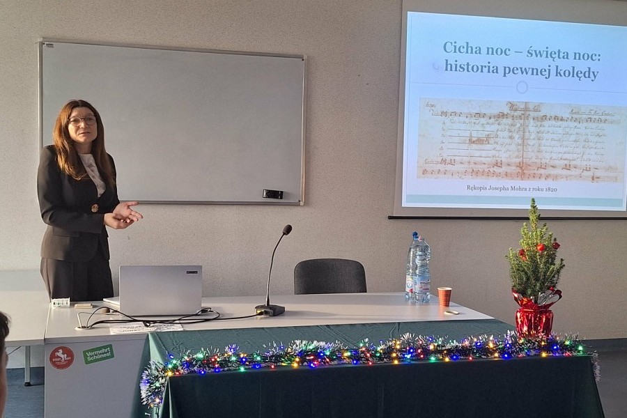 11 grudnia studenci i wykładowcy związani z kierunkiem „studia o Polsce” wzięli udział we wspólnym świątecznym spotkaniu. Tematem przewodnim wydarzenia była jedna z najbardziej znanych kolęd – „Cicha noc”. Historię powstania tego utworu przybliżyła uczestnikom prof. UAM dr hab. Justyna Krauze-Pierz, Pełnomocnik Rektora UAM ds. dydaktyki w Collegium Polonicum, specjalizująca się w literaturze austriackiej i szwajcarskiej.