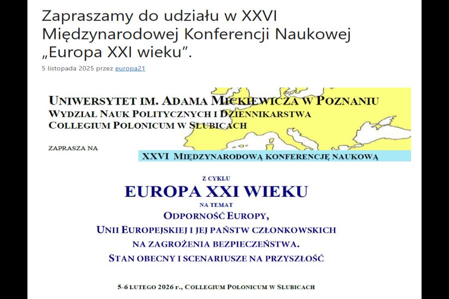 5–6 lutego 2026 r. w Collegium Polonicum odbędzie się XXVI Międzynarodowa Konferencja Naukowa „Europa XXI wieku”. Konferencja ta jest kontynuacją wieloletniego cyklu naukowego, w ramach którego od wielu lat analizowane są wyzwania, przekształcenia i perspektywy Europy w stuleciu XXI. Temat tegorocznego wydarzenia to: „Odporność Europy, Unii Europejskiej i jej państw członkowskich na zagrożenia bezpieczeństwa. Stan obecny i scenariusze na przyszłość.”